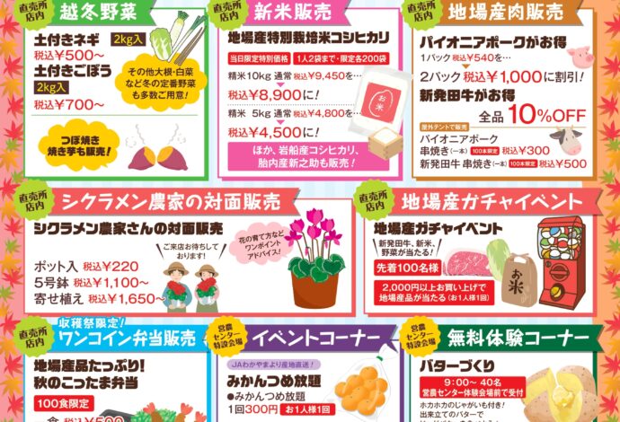 ピックアップ 2025.11.2211月23日 こったま~や収穫祭! 2025.11.2111月22日(土)NSTスマイルスタジアムとれたて!えいっとレシピ「砂里芋」放送 2025.11.1712月13日 JA北新潟大Yummy鍋会開催 参加者募集中! 2025.11.07ATMコーナー営業時間の一時変更(短縮)のお知らせ 2025.10.31法人のお客様の新規口座開設について(お知らせ)