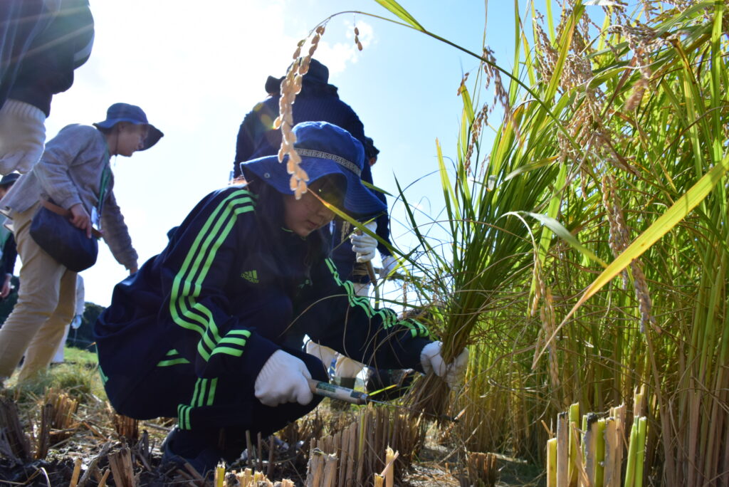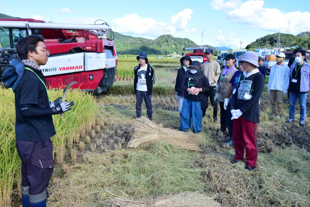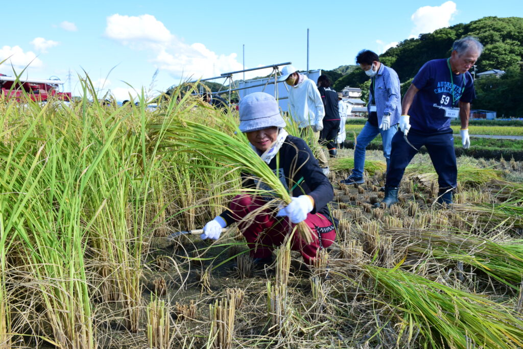 参加者たちは稲の刈り方を教わり、ザクザクと音を立ててコシヒカリの稲を刈り進めていました。「米を含めた食べ物がおいしくて」と春に続いて参加した参加者も多くいました。