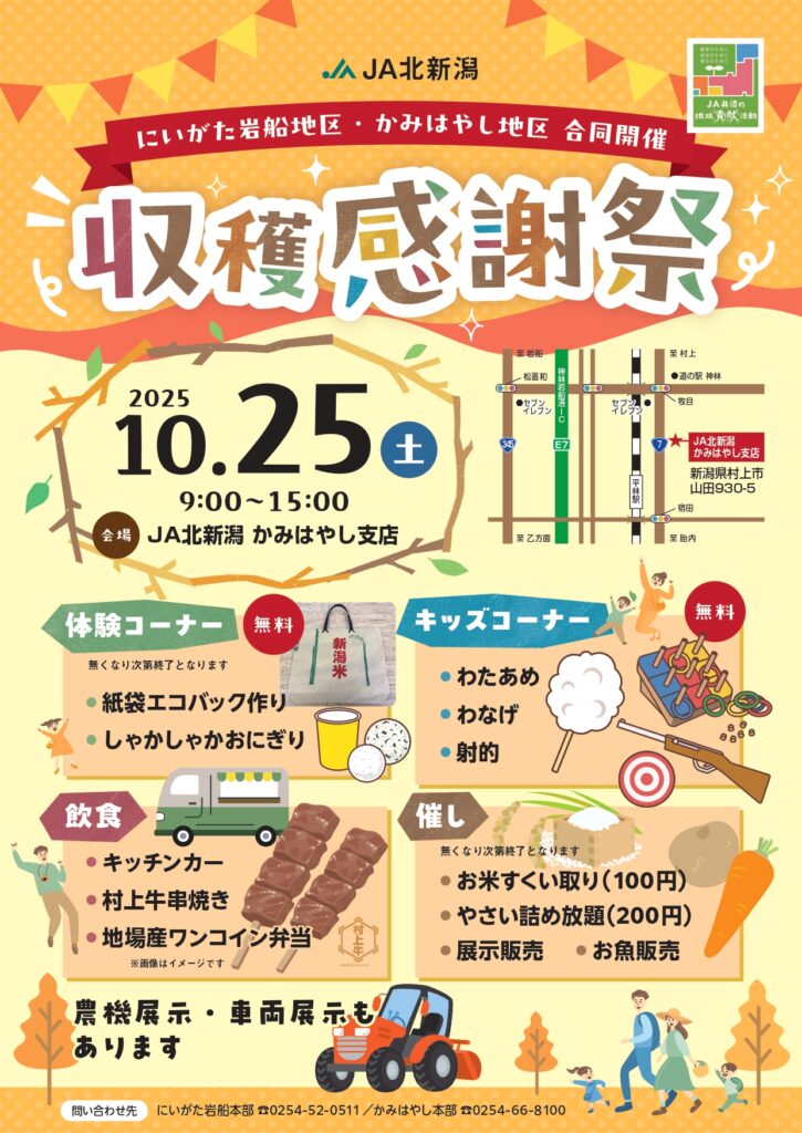 にいがた岩船地区・かみはやし地区合同の「収穫感謝祭」が10月25日(土)の午前9時から、かみはやし支店で開催されます。
