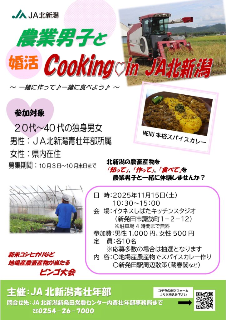 開催日時は11月15日(土)10:30~15:00。会場はイクネスしばたキッチンスタジオ。募集人数は男性(JA北新潟青壮年部部員)10人、女性(県内在住者)10人。参加費男性1000円、女性500円です。締め切りは10月31日。