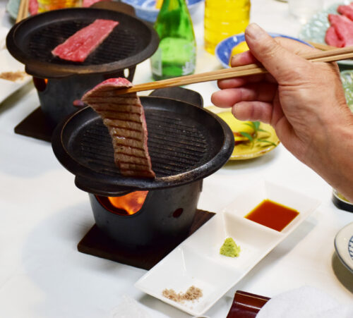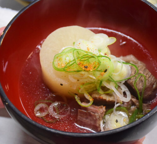 当日は、メイン食材である村上牛の生産者・漆間平さんから、他産地のブランド牛の餌を研究しながら村上牛配合飼料を確立し脂の味を追求してきた経緯などについて講話いただき、吉源の吉田昭一郎代表からは、カブの煮物、ネギのヌタ、おけさ柿の白和えなどの料理、陶板焼きにした希少部位「イチボ」の特徴や焼き方を説明していただきました。