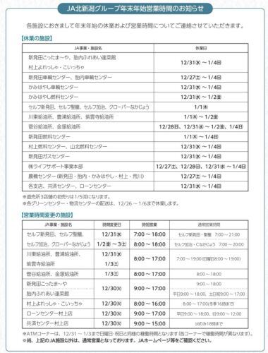 年末年始施設の休業について 2025年12月22日お知らせ 年末年始の休業および営業体制(休業・営業時間の変更のある施設のみ)についてご案内いたします。 « 前の記事へ 一覧 次の記事へ » カテゴリー 広報誌 売却予定用地 会長メッセージ 組織活動 合併に関するお知らせ 自己改革 採用 重要なお知らせ お知らせ トピックス キャンペーン 営農情報 コラム 直売所 JAバンク JA共済 イベント アーカイブ 月を選択 2026年2月 (4) 2026年1月 (8) 2025年12月 (12) 2025年11月 (8) 2025年10月 (18) 2025年9月 (12) 2025年8月 (8) 2025年7月 (12) 2025年6月 (14) 2025年5月 (15) 2025年4月 (17) 2025年3月 (15) 2025年2月 (4) 2025年1月 (7) 2024年12月 (19) 2024年11月 (12) 2024年10月 (14) 2024年9月 (13) 2024年8月 (9) 2024年7月 (7) 2024年6月 (7) 2024年5月 (13) 2024年4月 (13) 2024年3月 (8) 2024年2月 (3) 2024年1月 (1) 2023年10月 (6) 2023年8月 (1) 2022年5月 (4) 2022年3月 (4) 2022年2月 (4) 2022年1月 (6) 2021年12月 (4) 2021年11月 (4) 2021年10月 (3) 2021年9月 (4) 2021年8月 (4) 2021年7月 (4) 2021年6月 (4) 2021年5月 (4) 2021年4月 (4) 2021年3月 (4) 2021年2月 (4) 2021年1月 (4) 2020年12月 (4) 2020年11月 (4) 2020年10月 (4) 2020年9月 (4) 2020年8月 (4) 2020年7月 (4) 2020年6月 (4) 2020年5月 (5) 2020年4月 (4) 2020年3月 (3) 2020年2月 (3) 2020年1月 (3) 2019年12月 (4) 2019年11月 (3) 2019年10月 (4) 2019年9月 (4) 2019年8月 (2) 2019年7月 (3) 2019年6月 (5) 2019年5月 (5) 2019年3月 (4) 2019年2月 (4) 2019年1月 (3) 2018年12月 (3) 2018年11月 (2) 2018年10月 (1) 2018年9月 (1) 2018年8月 (1)