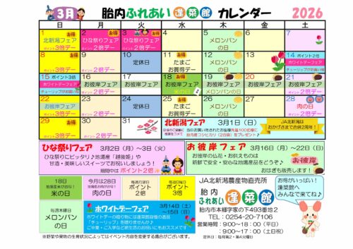 胎内ふれあい逢菜館3月のカレンダー🎎 2026年02月27日お知らせ « 前の記事へ 一覧 次の記事へ » カテゴリー 広報誌 売却予定用地 会長メッセージ 組織活動 合併に関するお知らせ 自己改革 採用 重要なお知らせ お知らせ トピックス キャンペーン 営農情報 コラム 直売所 JAバンク JA共済 イベント アーカイブ 月を選択 2026年2月 (9) 2026年1月 (7) 2025年12月 (12) 2025年11月 (8) 2025年10月 (18) 2025年9月 (12) 2025年8月 (8) 2025年7月 (12) 2025年6月 (14) 2025年5月 (15) 2025年4月 (17) 2025年3月 (15) 2025年2月 (4) 2025年1月 (7) 2024年12月 (19) 2024年11月 (12) 2024年10月 (14) 2024年9月 (13) 2024年8月 (9) 2024年7月 (7) 2024年6月 (7) 2024年5月 (13) 2024年4月 (13) 2024年3月 (7) 2024年2月 (3) 2024年1月 (1) 2023年10月 (6) 2023年8月 (1) 2022年5月 (4) 2022年3月 (4) 2022年2月 (4) 2022年1月 (6) 2021年12月 (4) 2021年11月 (4) 2021年10月 (3) 2021年9月 (4) 2021年8月 (4) 2021年7月 (4) 2021年6月 (4) 2021年5月 (4) 2021年4月 (4) 2021年3月 (4) 2021年2月 (4) 2021年1月 (4) 2020年12月 (4) 2020年11月 (4) 2020年10月 (4) 2020年9月 (4) 2020年8月 (4) 2020年7月 (4) 2020年6月 (4) 2020年5月 (5) 2020年4月 (4) 2020年3月 (3) 2020年2月 (3) 2020年1月 (3) 2019年12月 (4) 2019年11月 (3) 2019年10月 (4) 2019年9月 (4) 2019年8月 (2) 2019年7月 (3) 2019年6月 (5) 2019年5月 (5) 2019年3月 (4) 2019年2月 (4) 2019年1月 (3) 2018年12月 (3) 2018年11月 (2) 2018年10月 (1) 2018年9月 (1) 2018年8月 (1)