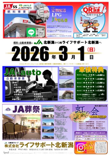 燃料事業・自動車事業の㈱ライフサポートへの事業譲渡について 2026年03月01日お知らせ 令和8年3月1日、JA北新潟 燃料事業・自動車事業は株式会社ライフサポート北新潟へ事業譲渡されました。 子会社へ譲渡されましても、JAの事業であることに変わりはありませんので、引き続きのご利用とご愛顧のほど、よろしくお願いいたします。 « 前の記事へ 一覧 次の記事へ » カテゴリー 広報誌 売却予定用地 会長メッセージ 組織活動 合併に関するお知らせ 自己改革 採用 重要なお知らせ お知らせ トピックス キャンペーン 営農情報 コラム 直売所 JAバンク JA共済 イベント アーカイブ 月を選択 2026年3月 (5) 2026年2月 (9) 2026年1月 (7) 2025年12月 (12) 2025年11月 (8) 2025年10月 (18) 2025年9月 (12) 2025年8月 (8) 2025年7月 (12) 2025年6月 (14) 2025年5月 (15) 2025年4月 (17) 2025年3月 (15) 2025年2月 (4) 2025年1月 (7) 2024年12月 (19) 2024年11月 (12) 2024年10月 (14) 2024年9月 (13) 2024年8月 (9) 2024年7月 (7) 2024年6月 (7) 2024年5月 (13) 2024年4月 (13) 2024年3月 (7) 2024年2月 (3) 2024年1月 (1) 2023年10月 (6) 2023年8月 (1) 2022年5月 (4) 2022年3月 (4) 2022年2月 (4) 2022年1月 (6) 2021年12月 (4) 2021年11月 (4) 2021年10月 (3) 2021年9月 (4) 2021年8月 (4) 2021年7月 (4) 2021年6月 (4) 2021年5月 (4) 2021年4月 (4) 2021年3月 (4) 2021年2月 (4) 2021年1月 (4) 2020年12月 (4) 2020年11月 (4) 2020年10月 (4) 2020年9月 (4) 2020年8月 (4) 2020年7月 (4) 2020年6月 (4) 2020年5月 (5) 2020年4月 (4) 2020年3月 (3) 2020年2月 (3) 2020年1月 (3) 2019年12月 (4) 2019年11月 (3) 2019年10月 (4) 2019年9月 (4) 2019年8月 (2) 2019年7月 (3) 2019年6月 (5) 2019年5月 (5) 2019年3月 (4) 2019年2月 (4) 2019年1月 (3) 2018年12月 (3) 2018年11月 (2) 2018年10月 (1) 2018年9月 (1) 2018年8月 (1)