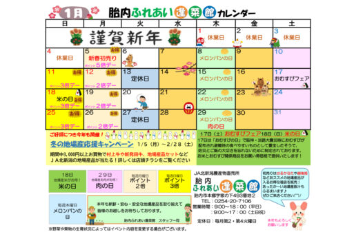 胎内ふれあい逢菜館1月のカレンダー🎍 2025年12月30日直売所 « 前の記事へ 一覧 次の記事へ » カテゴリー 広報誌 売却予定用地 会長メッセージ 組織活動 合併に関するお知らせ 自己改革 採用 重要なお知らせ お知らせ トピックス キャンペーン 営農情報 コラム 直売所 JAバンク JA共済 イベント アーカイブ 月を選択 2025年12月 (16) 2025年11月 (8) 2025年10月 (19) 2025年9月 (12) 2025年8月 (7) 2025年7月 (12) 2025年6月 (14) 2025年5月 (15) 2025年4月 (17) 2025年3月 (15) 2025年2月 (4) 2025年1月 (7) 2024年12月 (19) 2024年11月 (12) 2024年10月 (14) 2024年9月 (13) 2024年8月 (9) 2024年7月 (7) 2024年6月 (7) 2024年5月 (13) 2024年4月 (13) 2024年3月 (8) 2024年2月 (3) 2024年1月 (1) 2023年10月 (6) 2023年8月 (1) 2022年5月 (4) 2022年3月 (4) 2022年2月 (4) 2022年1月 (6) 2021年12月 (4) 2021年11月 (4) 2021年10月 (3) 2021年9月 (4) 2021年8月 (4) 2021年7月 (4) 2021年6月 (4) 2021年5月 (4) 2021年4月 (4) 2021年3月 (4) 2021年2月 (4) 2021年1月 (4) 2020年12月 (4) 2020年11月 (4) 2020年10月 (4) 2020年9月 (4) 2020年8月 (4) 2020年7月 (4) 2020年6月 (4) 2020年5月 (5) 2020年4月 (4) 2020年3月 (3) 2020年2月 (3) 2020年1月 (3) 2019年12月 (4) 2019年11月 (3) 2019年10月 (4) 2019年9月 (4) 2019年8月 (2) 2019年7月 (3) 2019年6月 (5) 2019年5月 (5) 2019年3月 (4) 2019年2月 (4) 2019年1月 (3) 2018年12月 (3) 2018年11月 (2) 2018年10月 (1) 2018年9月 (1) 2018年8月 (1)