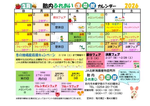 胎内ふれあい逢菜館2月のカレンダー 2026年02月05日直売所 « 前の記事へ 一覧 次の記事へ » カテゴリー 広報誌 売却予定用地 会長メッセージ 組織活動 合併に関するお知らせ 自己改革 採用 重要なお知らせ お知らせ トピックス キャンペーン 営農情報 コラム 直売所 JAバンク JA共済 イベント アーカイブ 月を選択 2026年2月 (5) 2026年1月 (7) 2025年12月 (12) 2025年11月 (8) 2025年10月 (18) 2025年9月 (12) 2025年8月 (8) 2025年7月 (12) 2025年6月 (14) 2025年5月 (15) 2025年4月 (17) 2025年3月 (15) 2025年2月 (4) 2025年1月 (7) 2024年12月 (19) 2024年11月 (12) 2024年10月 (14) 2024年9月 (13) 2024年8月 (9) 2024年7月 (7) 2024年6月 (7) 2024年5月 (13) 2024年4月 (13) 2024年3月 (8) 2024年2月 (3) 2024年1月 (1) 2023年10月 (6) 2023年8月 (1) 2022年5月 (4) 2022年3月 (4) 2022年2月 (4) 2022年1月 (6) 2021年12月 (4) 2021年11月 (4) 2021年10月 (3) 2021年9月 (4) 2021年8月 (4) 2021年7月 (4) 2021年6月 (4) 2021年5月 (4) 2021年4月 (4) 2021年3月 (4) 2021年2月 (4) 2021年1月 (4) 2020年12月 (4) 2020年11月 (4) 2020年10月 (4) 2020年9月 (4) 2020年8月 (4) 2020年7月 (4) 2020年6月 (4) 2020年5月 (5) 2020年4月 (4) 2020年3月 (3) 2020年2月 (3) 2020年1月 (3) 2019年12月 (4) 2019年11月 (3) 2019年10月 (4) 2019年9月 (4) 2019年8月 (2) 2019年7月 (3) 2019年6月 (5) 2019年5月 (5) 2019年3月 (4) 2019年2月 (4) 2019年1月 (3) 2018年12月 (3) 2018年11月 (2) 2018年10月 (1) 2018年9月 (1) 2018年8月 (1)