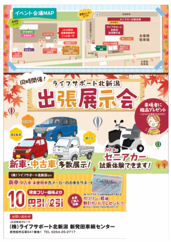 営農センターではほかに、ライフサポート北新潟による出張展示会も開催。新車・中古車を多数展示するほか、セニアカーの試乗体験もできます。来場者には粗品のプレゼントもあります(なくなり次第終了)。