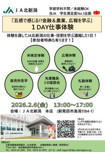◎【2月6日開催】五感で感じる!?JA北新潟の金融・農業、広報を学ぶ1DAY仕事体験 申込受付中です。